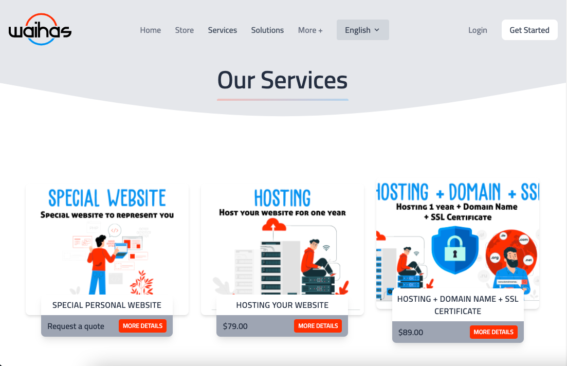 Waihas is an agency specialized in IT domain, provides multiples services such as Hosting, Domain name, building costume websites for clients and also selling pre-made websites and applications.